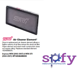 Drop-in replacement air cleaner element allows a higher volume of air flow versus the stock air filter. Paper element and steel mesh construction does not require oiling. Replaces standard element 16546AA020.Impreza WRX (2002-2007) & WRX STI (2004-2007): ST165464S000